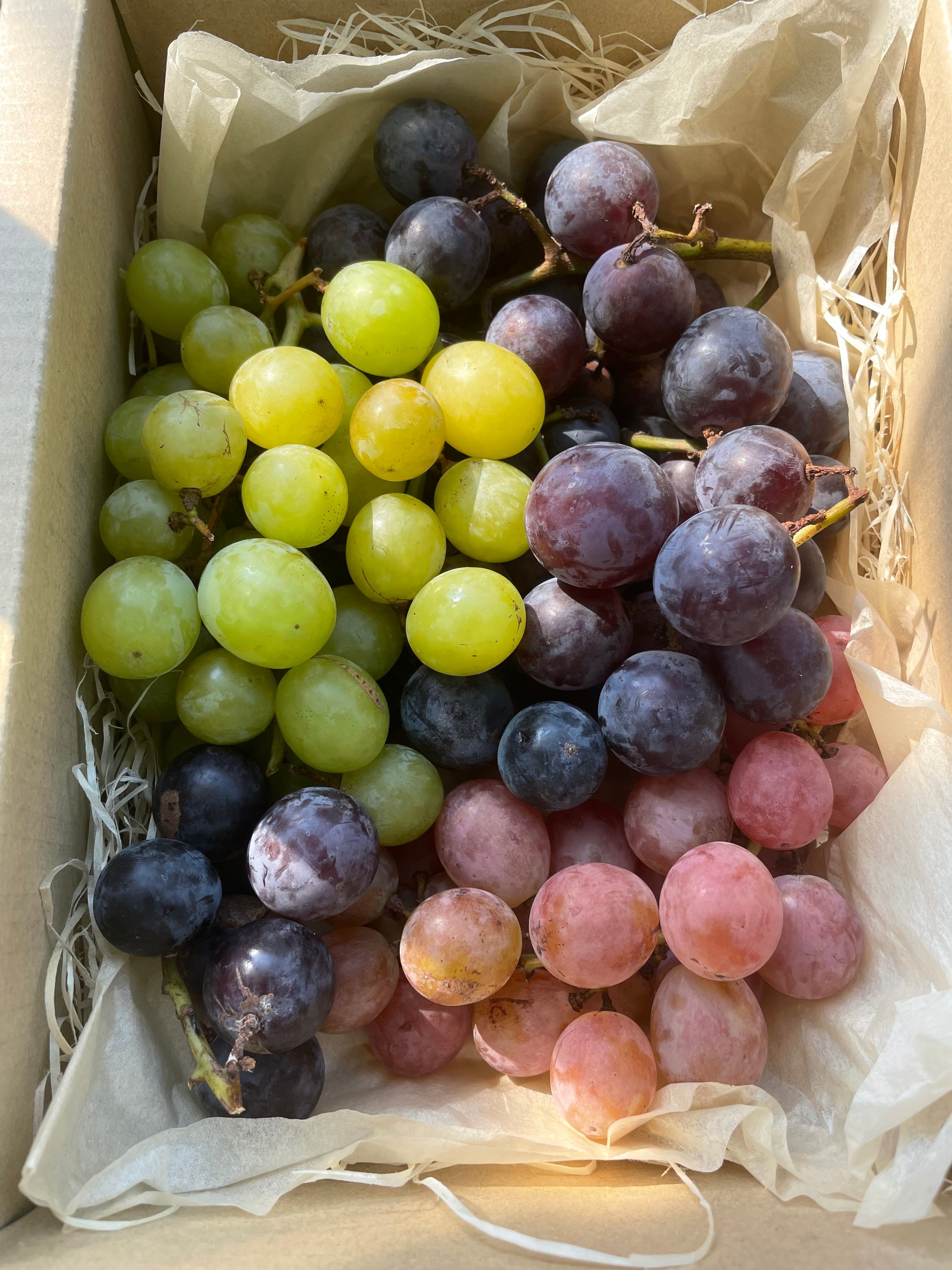 滋味のピオーネ、気品の安芸クイーン、元気なシャイン、収穫時期が少しずつ異なる3種がミックスできる今だけのお箱を、君だけにお届け。